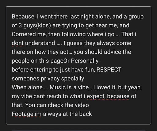 Because, i went there last night alone, and a group of 3 guys(kids) are trying to get near me, and Cornered me, then following where i go…. That i dont understand …. I guess they always come there on how they act… you should advice the people on this pageOr Personally before entering to just have fun, RESPECT someones privacy specially When alone…. Music is a vibe.. i loved it, but yeah, my vibe cant reach to what i expect, because of that. You can check the video Footage.im...