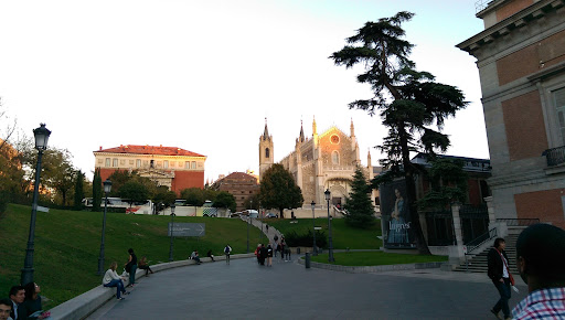Read moreLa Iglesia de San Jerónimo el Real, o mejor conocida como 'los Jerónimos', la cual ha estado durante siglos ligada a eventos que han marcado la historia de Madrid y España, y por tanto también de la América hispánica colonial, habiendo servido como capilla real y en donde se coronaron los monarcas españoles desde Felipe II hasta Isabel II. El origen de esta iglesia está en el primitivo Monasterio de San Jerónimo el Real fundado en 1436 por Enrique IV 'El Impomente, al lado del río Manzanares, desde donde tuvo que ser trasladado hasta su emplazamiento actual (a espaldas del Museo del Prado) a finales del siglo XV debido a las continuas enfermedades de los monjes, quienes lo desmontaron y movieron piedra a piedra. Su estilo inicial era gótico tardío o isabelino con elementos renacentistas (cuyo diseño se atribuye con dudas a Enrique Egas), pero a lo largo de su historia ha sufrido muchas variaciones con los cambios de tendencias y por los daños importantes causados tras las exclaustraciones durante la invasión napoléonica y la desamortización de Mendizábal, correspondiendo su aspecto actual neogótico a la restauración acometida entre 2007 y 2011. Su planta es de cruz latina, con una sola nave cubierta por bóvedas de terceletes, flanqueada por 10 capillas laterales entre contrafuertes, sobre las cuales se abren triforios. Poseía un claustro de estilo renacentista, erigido en 1612 bajo la dirección Miguel Martínez, el cual se encontraba en situación deplorable y fue recuperado en la ampliación del Museo del Prado por Rafael Moneo, siendo conocido popularmente por aspecto exterior como «El cubo de Moneo". También existía junto al monasterio el llamado 'Cuarto Real', lugar de descanso y meditación de la familia real que luego fue ampliado como el Palacio del Buen Retiro en tiempos de Felipe IV, no conservándose nada de él actualmente, pero fue el origen del Parque del Retiro. La iglesia alberga importantes tesoros artísticos, dentro de los que destaca una colección de cuadros de la escuela barroca madrileña pertenecientes al Museo del Prado, que incluyen obras de Juan Carreño de Miranda (Santa Ana enseñando a leer a la Virgen María), Fray Juan Andrés Rizi (San Benito bendiciendo el pan), Francisco Rizi (Adoración de los pastores), José Moreno (Huida a Egipto) o Antonio de Pereda (Inmaculada Concepción, San Francisco de Asís en la Porciúncula), así como un 'San Jerónimo pendiente' de Alonso Cano (muy similar al que se encuentra en el Museo de Bellas Artes de Granada). En el altar mayor destaca el cuadro de 'la última Comunión de San Jerónimo', obra de proporciones monumentales del pintor neoclásico Rafael Tegeo, con influencias del barroco clacisista boloñés, en especial de Annibale Carracci y Domenichino. Esta pintura está flanqueada por imágenes de Santa María y San José atribuidas a Luis Salvador Carmona. En una capilla del crucero en lado del Evangelio se encuentra un impresionante retablo neogótico que data de 1855, obra de José Méndez, presidido por una peculiar Inmaculada alada. A la lado de este retablo destaca la talla del Cristo de la Buena Muerte, obra maestra de Juan Pascual de Mena. Quizá los fragmentos que mejor nos remiten a la decoración original de este templo, son unas pinturas murales del siglo XVI representando escenas de la pasión y unos bajorrelieves, muy dañados, de estilo renacentista, en una de las...