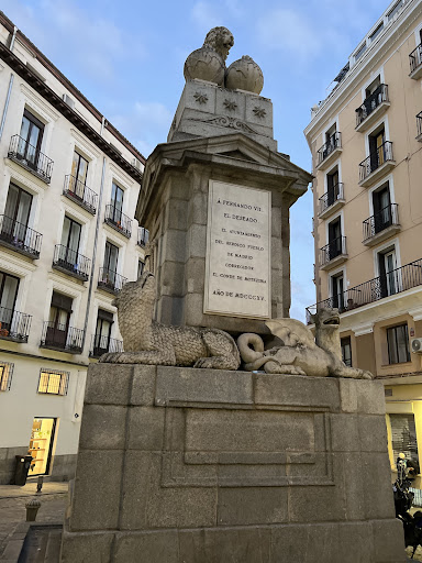 "La Fuentecilla" on Calle de Toledo in Madrid is a historic fountain built in 1816 in honor of King Ferdinand VII, following Spain’s liberation from Napoleonic rule. The fountain is located at the intersection of Calle de Toledo and Calle de Arganzuela and is considered the first monument erected in Madrid after the Spanish War of Independence (1808–1814). It is made of granite and decorated with symbols of Madrid – the bear and the strawberry tree and the Castilian dragon, along with an inscription dedicated to the king. At the top, there is a lion holding two hemispheres, symbolizing the power and unity of the Spanish Empire. The precise origin of some architectural elements is uncertain – some suggest they were taken from a Premonstratensian monastery destroyed...