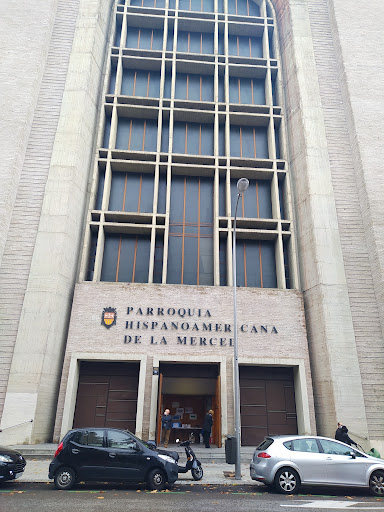 En junio de 1949 se produce el fallo del jurado designado para el Concurso de Ideas para la construcción de la Basílica-Convento Hispano-Americano de Nuestra Señora de la Merced, otorgando el primer premio al trabajo suscrito por los arquitectos Luis Laorga y Francisco Javier Sáenz de Oíza, en competición con figuras tales como Miguel Fisac, Rodolfo García-Pablos, Casto Fernández Shaw, etc. En la definición del proyecto se tuvo en consideración el preservar los elementos tradicionales de la arquitectura religiosa en general y española en particular, reflejando al tiempo la manera de ser y pensar de la época actual; todo ello sin olvidar que el carácter de la Basílica Hispanoamericana condicionaba el tener presentes los elementos definidores de nuestra arquitectura colonial, así como el emplazamiento del templo que aconsejaba una solución contemporánea, de líneas tranquilas y sencillas, acordes con la arquitectura de su entorno. Con estas premisas significó esta iglesia, en su momento, un primer paso hacia un nuevo horizonte de la arquitectura religiosa del país. La construcción se concreta en un volumen paralelepipédico exento, en el que, junto a una gran austeridad, destaca lo desproporcionado de la altura en relación con la anchura de su planta. Se trata de una basílica con traza de cruz latina y una sola nave longitudinal de cinco tramos, con capillas en sus laterales, y otra transversal formando el crucero. Lejos de haberse cubierto, como estaba previsto en la propuesta ganadora, con bóvedas encasetonadas, se llega a una solución de estructura ligera tridimensional de tubo, que se dispone en forma de cañón rebajado en las naves y de bóveda de arista en el crucero, cuya ligereza resalta aún más la verticalidad del espacio interior. Entre las fachadas de gran austeridad decorativa, destaca la principal, conformada por un elemento central de hormigón visto en cuyo interior se abre un gran arco de medio punto, continuación de la bóveda de la nave, que encuadra un sencillo encasetonado vertical, ejecutado igualmente en hormigón, en cuyo fondo se dispone un plano de vidrio sustentado por una ligerísima carpintería metálica. Este gran "rosetón" descansa sobre un poderoso dintel, también de hormigón visto, bajo el cual se encuentran las tres puertas de acceso encuadradas por una sencilla moldura...