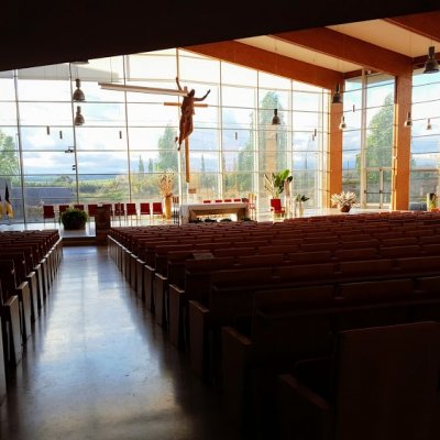 Impresionante iglesia de estilo moderno con luz a raudales y espacio de asientos con efecto grada. Desmerece el Cristo que parece a medio terminar.