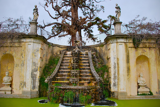 Los elementos decorativos como la gran cascada de mascarones, la exedra, el muro de hornacinas, el estanque superior y la gruta artificial nos recuerdan en parte a elementos franceses pero también al jardín del pleno renacimiento italiano.