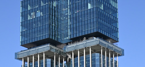 Von außen sieht es ein bisschen aus wie etwas aus einem Science-Fiction-Film der 70er. Die grünliche Glasfassade, kombiniert mit den charakteristischen roten „Hosen“, wie die vertikalen Strukturen genannt werden, die die Türme verbinden, verleiht dem Gebäude ein futuristisches, fast verspieltes Aussehen. Man könnte meinen, sie wären das Headquarters für eine Geheimgesellschaft von Superhelden, die sich nachts im Hut oben treffen. Dieser Hut – offiziell als „Kronenstruktur“ bekannt – ist wahrscheinlich das auffälligste Merkmal der Türme. Er sieht aus wie eine schicke, metallene Tischplatte, die den beiden Türmen sagt: „Bleibt schön zusammen, Kinder.“
