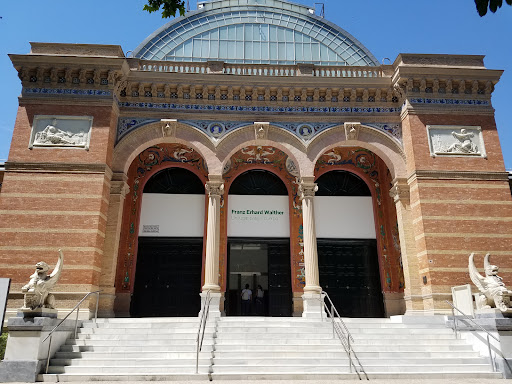 En las fachadas y en el pórtico de entrada podemos ver las cerámicas de Daniel Zuloaga, el famoso ceramista, a quien se debe también la decoración del vecino Palacio de Cristal, del edificio ABC Serrano, la Casa de Allende y el edificio de la Compañía Colonial en la calle Mayor. Quizá la parte más vistosa sea la entrada, en la fachada sur, con una elegante escalinata de mármol blanco, adornada a sus lados por dos figuras de animales mitológicos, y a continuación un pórtico con tres arcos de medio punto sobre columnas jónicas. A los lados del pórtico existen dos discretos bajorrelieves, a la izquierda dedicado a las Bellas Artes y a la derecha dedicado a la Minería. Curiosamente, entre los adornos de la fachada, figura la efigie del pintor Diego Velázquez, ¡como para añadir confusión al asunto del nombre! En la galería central, de dieciocho metros de altura, las cubiertas y las columnas de hierro son las únicas protagonistas. Actualmente es sede de exposiciones del Museo Reina Sofía. La entrada es gratuita. Abre de 10 a 18 en invierno (Noviembre-Febrero), de 10 a 21 en horario de verano (Abril-Septiembre) y de 10 a 19 en...