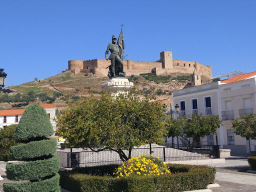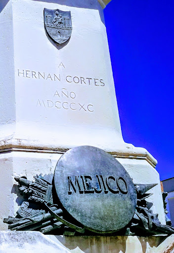 El 13 de Abril de 1890 se procedió a labendición y colocación de la primera piedra del pedestal, realizado en piedra de Novelda. El sitio elegido fue el centro de la plaza, a escasos metros del lugar que ocupara la casa natal de Hernán Cortés. El 11 de noviembre llegó por ferrocarril la estatua de bronce y el conjunto escultórico, de cinco toneladas, procedente de la fundición de Federico Masriera de Barcelona. Tras los avatares de hundimiento de algunos de los más de treinta carros -tirados por bueyes- que transportaban el conjunto escultórico a la villa, el día 16 fue colocada en su actual emplazamiento. El 2 de Diciembre de ese mismo año, de 1890, aniversario de la muerte de Cortés, se inauguró el citado monumento. La estatua está rodeada por dos cabezas de león unidas por una barra, en cada uno de los lados del pedestal. Sobre ellas cuatro cartelas, también de bronce, con los nombres de las cuatro batallas más importantes de la conquista de Méjico. Otumba, Tlascala, Tabasco y Méjico. En el frontal del pedestal aparece un escudo de Medellín y la dedicatoria. "A HERNÁN CORTÉS. AÑO MDCCCXC". Lo más importante del monumento, como no podía ser de otra manera, es la estatua de Hernán Cortés, concebida con fuerza y sencillez. La obra escultórica presenta a Cortés en traje militar, sosteniendo el estandarte de Castilla y el cetro de mando, y teniendo bajo sus pies trozos de altares e...