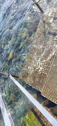 There is a sea pool to the right of the beach with steps and a few fish.