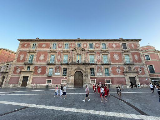 El anterior edificio del Palacio Episcopal estaba ubicado también en la Plaza del Cardenal Belluga, pero situado justamente en el lado opuesto del actual edificio. Con motivo de la construcción de la fachada principal de la Catedral a cargo de Jaime Bort, se planteó la necesidad de crear un espacio abierto ante ella que permitiera una contemplación de la misma en todo su esplendor. Al mismo tiempo, el viejo edificio del Palacio Episcopal no se encontraba en buen estado debido a las continuas crecidas del Río Segura. Por ello, se decidió la construcción de un nuevo inmueble en la zona que antes ocupaba la Casa señorial del Marqués de los Vélez. El verdadero impulsor de esta obra fue el Obispo D. Juan Mateo López. A su muerte, será el nuevo Obispo, D. Diego de Rojas y Contreras el encargado de continuar la construcción. El edificio del Palacio Episcopal se encuentra situado entre dos plazas. Por un lado, su fachada principal queda ubicada en la Plaza Cardenal Belluga , mientras que su fachada posterior se abre a la Plaza de la Glorieta, próxima al Ayuntamiento y frente al cauce del río Segura junto al que conserva un mirador panorámico también llamado “ el mirador del obispo”. Las obras de construcción se realizaron entre los años 1749 y 1768. El edificio es de planta cuadrada y se articula en torno a un gran patio central de forma cuadrangular. Este patio está recorrido en su parte inferior por arcos de medio punto situados entre pilastras que dan lugar a la existencia de una galería porticada decorada de estilo barroco. Sobre éstos descansa un entablamento decorado por triglifos y metopas. En el piso superior, se utilizaron pilastras con capiteles de orden jónico, y balcones coronados por frontones partidos, en los que se colocaron medallones ovalados con las figuras de los Obispos de la Diócesis sostenidos por niños. Las fachadas se encuentran ricamente decoradas. Ambas están formadas por tres bandas superpuestas de color rojizo separadas entre sí por molduras. En la fachada principal se dispone una gran portada central flanqueada por pilastras jónicas decoradas con emblemas episcopales y escudos circulares en su parte central. Coronando esta portada se encuentra un gran balcón donde el elemento decorativo más destacable es el gran escudo del Obispo Rojas y Contreras. La fachada posterior también presenta una portada central flanqueada por columnas con fuste estriado, y situada tras una reja. Sobre ella se sitúa un balcón realizado en forja. El conjunto está rematado por el escudo del Obispo D. Juan Mateo López. A esquina noroeste del edificio encontramos la puerta de la preciosa capilla del palacio, joya del barroco en su transición al rococó. Es de planta circular y cuenta con cuatro capillas laterales. La cúpula al igual que el resto de la capilla está ricamente decorada con yeserías barrocas. Este templo se utiliza para la adoración perpetua del Santísimo y se encuentra abierta al...