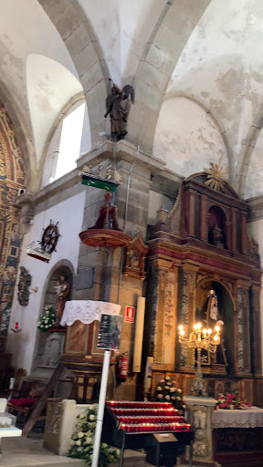 🙏 Afortunadamente, los retablos laterales sí se salvaron, conservando parte del patrimonio original. En el centro del altar preside una imagen muy querida: la Virgen da Barca 👑🕊️, una figura de gran devoción y fervor popular, especialmente entre los peregrinos que llegan al final de su largo camino.