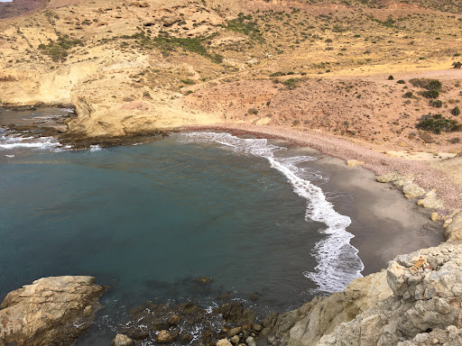 Beautiful small beach, quiet early June. About 75m wide. Mixed public, bath clothes and nudist, but in common to come with respect to rest and relax. Lower half dark sand all the way into the water, upper half red stones. Access a 10 min walk from small car park. Last 50m a bit steep, but doable with flip-flops. Very good snorkelling with several rocks close to the beach. Beyond more frequented beaches of the area. At the end of dirt road, same as to Playa de Monsul. With 20 km/hr easily doable by normal car. Dirt road continues to Faro de Cabo de Gata, but closed from here for cars, but open for bicycles...