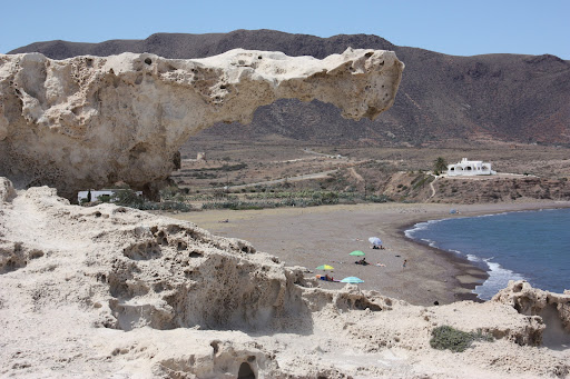 La Playa del Arco, ubicada en Los Escullos, es un amplio arenal de unos 350 metros de longitud y unos 40 metros de anchura, que se caracteriza por albergar, en su margen derecho, una amplia duna fosilizada formada, durante el cuaternario, bajo el mar por caliza oolítica y que tras el descenso del nivel del Mediterráneo se hizo visible en la zona litoral. Más tarde la erosión provocada por el viento, la lluvia y las olas remodeló la duna creando curiosas formas, siendo la más significativa la denominada "El Arco" que da nombre a la playa, que también es conocida como...