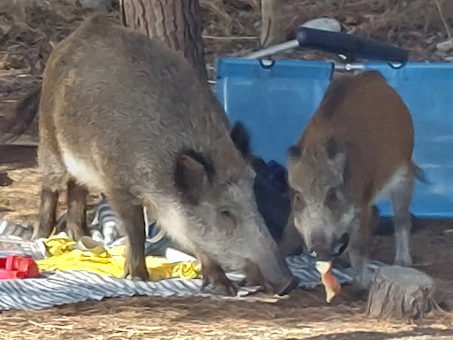 Es gibt hier allerdings einige Wildschweine, die nicht menschenscheu sind. Eins haben wir den einen Tag im Gebüsch gesehen, am anderen Tag standen plötzlich 2 Wildschweine direkt neben uns auf der Decke, als wir unter den Bäumen lagen. Wir haben erst mal das weite gesucht und zugeschaut, wie sie unsere Kühlbox geleert haben und unsere Mülltüte zerpflückt haben. Also falls ihr dort unter den Bäumen chillt, hängt Müll und Essen etwas höher in die Bäume :D Uns kamen übrigens ein paar Spanier zur Hilfe, die dort gelegentlich übernachten und meinten, dass die Wildschweine ohne Frischlinge friedlich sind. Sie sind direkt zu den Schweinen hingegangen und haben uns geholfen, unsere Sachen und den Müll...