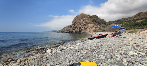 Small rocky beach. Crystal clear water. Park at parking lot on hill and walk down rough trail or take road down past paper mill and orchards to beach. Take a left to see where the Honey River meets the Alboran Sea! A rock dam was created so you can bath in clean, clear fresh water. The area is know for kayaking, paddle boarding, and snorkeling. But a sign suggests that the area is now closed to diving due to fish...