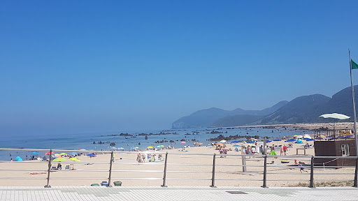 Long, clean, sandy beach. The water is shallow and when the tide is down kids can reach the rocks and collect little black crabs. Locals take their chairs and sun umbrellas but these can also be hired. There is a small library for those who forgot their books at home or would like to check the papers. Plenty of bars and restaurants around to grab a quick bite; many offer roast chicken for take away, however this has to be ordered 2...