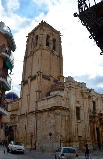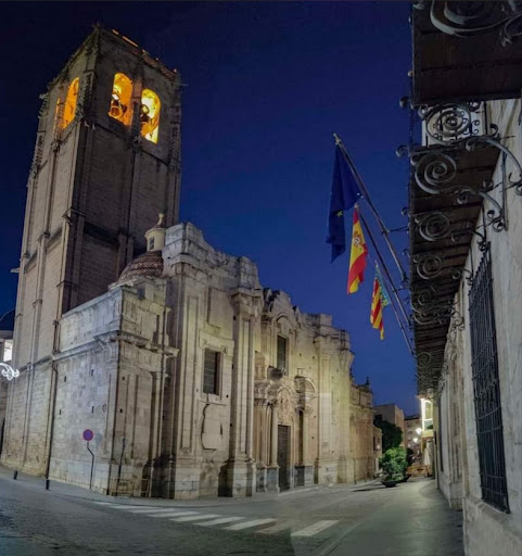 Edificado en el siglo XIV y con reformas en los siglos XVI y XVIII. Consta de una sola nave y capillas laterales entre los contrafuertes; posee dos portadas y un campanario. En gran parte el templo es de factura gótica, aunque posee partes construidas o ampliadas en estilo barroco. El edificio fue declarado Bien de Interés Cultural el 31 de octubre de 1971 y Monumento Nacional en 1971, con la ley de 1985 Bien de Interés Cultural. El edificio posee una imponente torre campanario gótico decorada con pináculos y una bóveda de crucería en el cuerpo de campanas. Junto con el Miquelet de la Catedral de Valencia, son los únicos campanarios góticos de esta tipología en la Comunidad Valenciana. El mismo posee un importante conjunto de campanas, en su mayor parte de los siglos XVII al XIX. Además de una de las piezas de relojería más antiguas de España y la más antigua de la Comunidad Valenciana, datado de principios...
