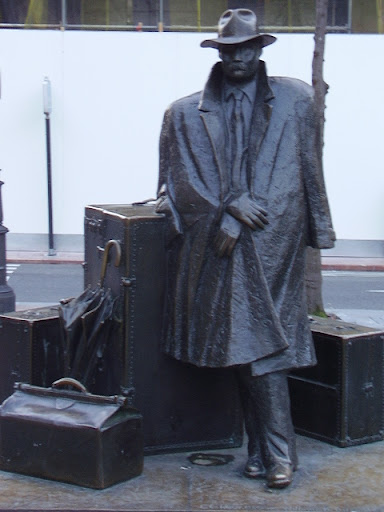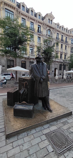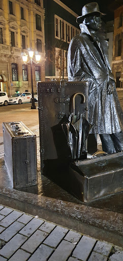 Read moreEl regreso de Williams B. Arrensberg (1993) en una esquina de la Plaza Porlier d'Uviéu (Asturies). Bronce, de tamaño natural, conocido como 'El viajero' que representa a un hombre con sombrero y gabardina apoyado como un paraguas en un baúl, dos maletas y un maletín esperando, recién llegado a la ciudad, que alguien le recoja. sobre pedestal del mismo material. Obra del pintor y escultor salmerón -¡muches veces nun yes d'onde naces sinon d'onde paces, y aunque naciera nel 38 en Santurtzi, dende'l 41 criose en Sama Llangréu!- Eduardo Úrculo...