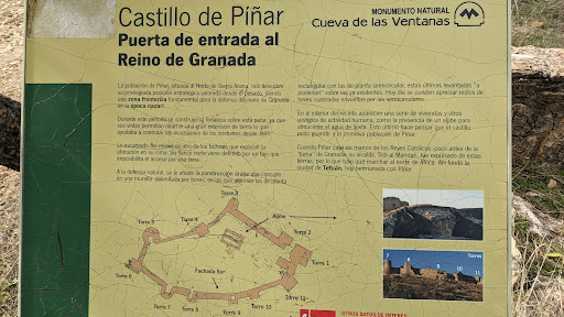 Read moreJunto a Píñar, y en la cumbre de un cerro, se encuentran los restos de un castillo árabe. Su acceso se realiza a través de un intrincado camino de tierra y los últimos metros andando campo a través. El castillo presenta restos de ocho torres en muy mal estado de conservación, apenas unidos por restos de muralla. Presenta la peculiaridad de tener una torre de planta circular en el paño donde se encuentra la puerta de acceso, siendo las demás cuadradas. En el interior del recinto se encuentra un aljibe formado por dos bóvedas realizadas en piedra.