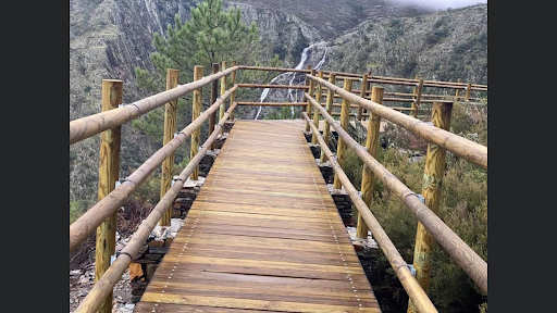 Por encima del mirador del chorro de los Ángeles..... Puedes seguir en coche cuando llegas como a un cruce de caminos ya en la montaña , hay un hito que señala sendero del chorro los Ángeles aunque estaba roto en el suelo puedes seguir con el coche, te vas a encontrar una berja que pone zona sensible , pues pasas y como a unos 10 minutos andando te encuentras esta bonita pasarela desde la que puedes ver buitres leonados también había un grupito de personas haciendo...