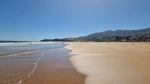 Tiene todos los servicios a pie de playa: baños público gratuitos y limpios, duchas con lavapies y asientos para personas con problemas de movilidad o cualquier dificultad. Servicio de socorristas desde las 12 del mediodía hasta las 20h más o menos. Zona verde con mesas y bancos, parque infantil y cerca hay un camping. La playa es amplia en hora de marea baja, a mitad de playa hay un saliente rocoso por el que no se puede cruzar la playa al subir la marea. En el extremo más alejado hay una zona como una pequeña cala, muy bonita con ducha, escalera de acceso y socorrista pero no se cuanto tiempo está. La zona de entrada es muy pedregosa, pero si caminas un poco ya es arena fina. Es una playa de mucho oleaje, suele tener una zona de baño restringida y mucha gente practica deportes como windsurf, skatesurf y, por supuesto, surf. Hay una tienda de alquiler de tablas a pie de playa. Hay parking, a 2€ por coche estés lo que estés. Creo que a partir de cierta hora de la tarde, ya avanzada la tarde, la entrada es libre. El parking a pie de playa es pequeño y separan con cuerdas las "plazas", una vez que pagas aparcas donde veas.. Un poco caótico en ese aspecto. Es de hierba y tierra, y no se porque continuamente encharcado las dos últimas veces, sin haber llovido. Hay zona de aparcamiento antes de llegar a la playa, en los laterales de la carretera, señalados con cartelones, como nunca he visto un hueco libre allí pues no se si son gratis o si mientras hay sitio alguien está allí cobrando, ni idea. El camino de Santiago pasa por allí, por los pequeños remontes que hay justo detrás de la playa. Así que es habitual ver peregrinos incluso descansando en la zona de playa. El paisaje es precioso y hay varios chiringuitos y...