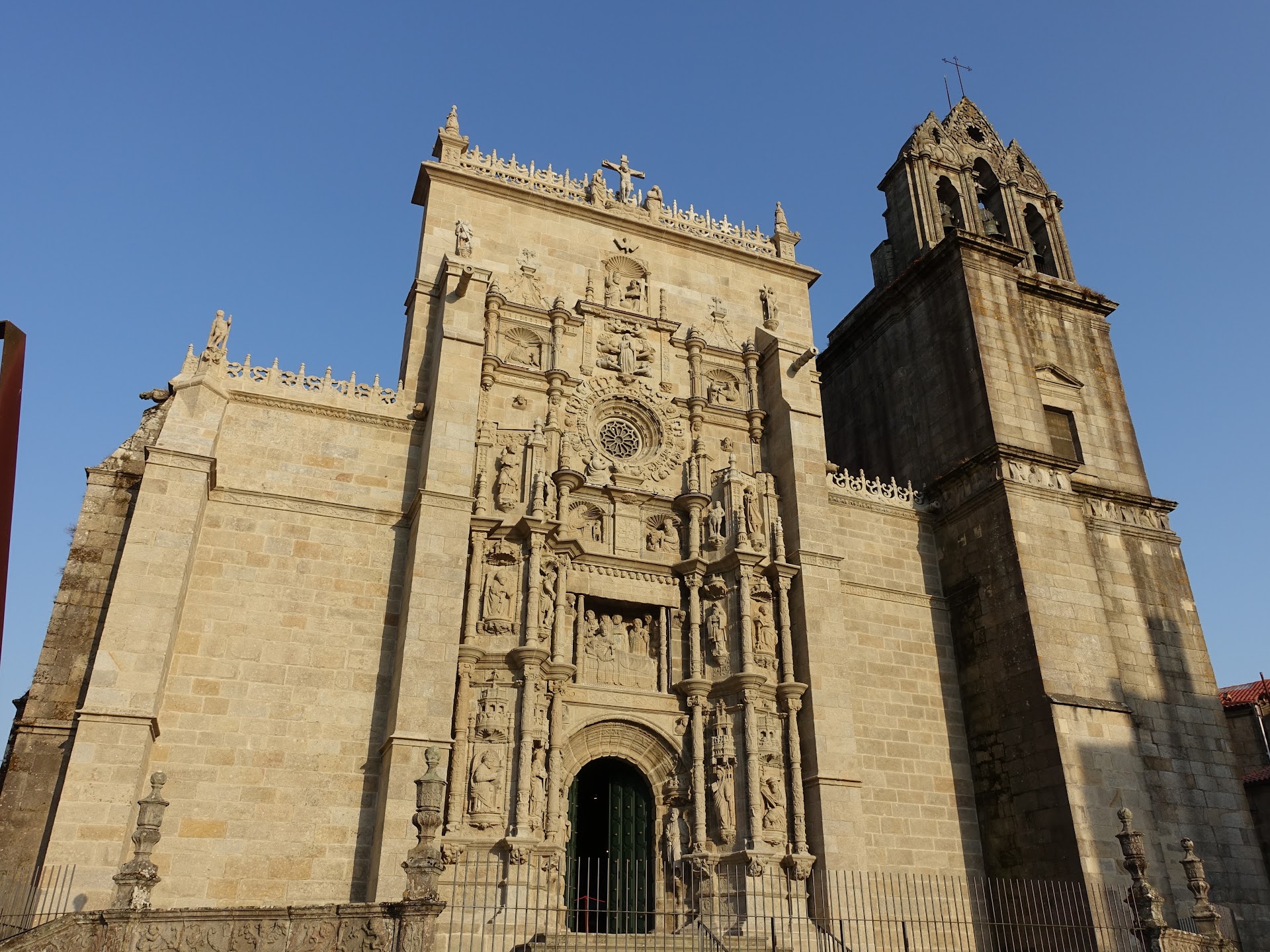 Read moreFoi construída no século XVI polo Gremio de Mareantes, no lugar doutra igrexa románica dos séculos XII-XIII, en ruínas, da que se conserva unha talla dun Pantocrator policromado. O deseño da actual basílica é obra de Diego Gil e Juan de los Cuetos. A nave norte e a fermosa fachada principal, de estilo Plateresco, é obra de Cornelis de Holanda e Jõao Nobre, entre 1541 e 1548, e está adicada á Virxe María. Tamén é obra de Cornelis de Holanda a Contraportada, unha das obras máis orixinais con corenta relevos de escenas bíblicas, emblemas, figuras e alegorías. A nave central, con bóveda de crucería estrelada, ten gravada a data de finalización en 1559. As bóvedas rematan en dezasete craves con motivos decorativos e unha cun escudo dos Fonseca. O Antigo retablo do altar maior do século XVI, contratado polos mareantes da Confraría do Corpo Santo a Jácome de Prado, exhíbese no Museo Provincial. O que agora vemos, do século XIX, foi realizado polo tallista santiagués Maximino Magariños quen tamén fixo o púlpito e as estacións do Vía Crucis. Na capela dá Virxe do Carme, patroa dous mariñeiros, podemos ler a inscrición gótica en pedra: "OS DO CERCO: DE YOAN NETO E YOAN DE COLLON FEZERON ESTA CAPELA”. A Porta do lado sur coa Virxe co Neno en brazos no centro, San Miguel á súa dereita e San Pedro Telmo á súa esquerda, ambos los dous patróns das confrarías de mariñeiros e mareantes con sede nesta parroquia, é obra de Diego Gil ao redor de 1539. A torre das campás ten un friso decorado coas figuras de Xesús e os doce apóstolos, representación de Últíma Cea, e na base da torre a Virxe de Quitapesares, representada como unha muller vestida de sol coa lúa aos seus pés e unha coroa de estrelas sobre a súa cabeza, protectora dá cidade, reprodución doutra máis antiga que se veneraba nunha ermida de Os Praceres. Na crista da fachada principal do templo, de elaborado encaixe en pedra, represéntanse remeiros e pescadores recollendo as súas redes. E nas cristas do lado sur están representados, en mandorlas, Xesús cos apóstolos e profetas, en total dezasete imaxes. Nos remates e esquinas to tellado, figuras de Hércules e numerosas gárgolas. No parte exterior da ábsida vemos o escudo de Alonso de Fonseca, arcebispo de Santiago, e debaixo unha imaxe da Virxe da O, patroa...