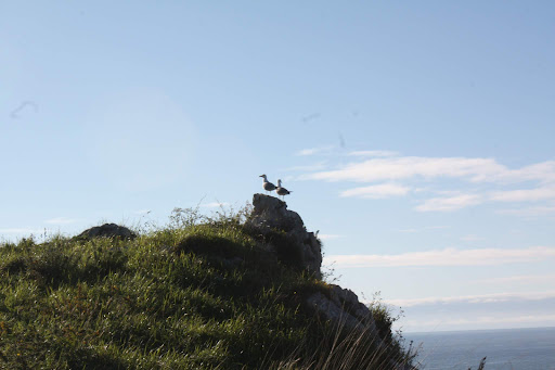 Pequeñas penínsulas verticales dan cobijo a los nidos de gaviotas y cormoranes a lo largo del camino. Un enorme tómbolo de roca se erige en un pequeño entrante del acantilado. Dos arcos de piedra gigantes aparecen, mientras caminamos, cual puentes hacia ninguna parte, uniendo fragmentos de acantilado. En el cielo, busardo ratonero y cernícalo común son frecuentes, dos cazadores escudriñando el suelo, listos para dejarse caer sobre los pequeños animales que forman parte de su dieta.