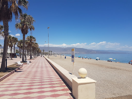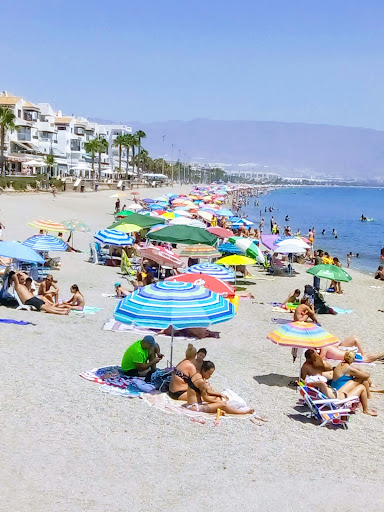 The best and cleanest beach in Roquetas del Mar,nice clean sand and water 💧,like California beaches.There is toilet near entrance and little kiosk with coffee and Belgian waffles,nice cold frappe and ice cream. Chairs for bronzing you can have with a mattress and small table for 5euro There a parking near the beach and in 10 passes from beach you can find restaurant...
