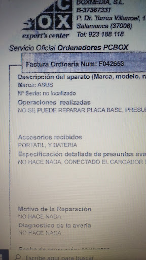 Read moreYo no tengo ninguna queja en cuanto a atención y amabilidad. En cuanto a resultado de reparación, si no depende de ellos, sino del fabricante que no proporciona solución a una serie de portàtiles que presentan el mismo defecto: fallo en el soldado de la esquina de la pantalla, fallo en el BIOS...y no arranca el sistema operativo...eso no es culpa de PCBOX Salamanca sino de una gran multinacional japonesa que, en su divión informática de portátiles vende productos poco fiables. Yo me preguntó: un portátil de gama alta que compré en El Corte Inglés hace tres años cerca de 900 euros con un procesador Intel 7...es normal que haya estado tres veces en taller, pasando dos veces por la propia firma...ah! De tres años lleva más de siete meses en taller, le cambiaron pantalla...y ya no espero que vuelva: lo último, según la multinacional japonesa, que no quiere saber nada:"...a lo mejor cambiando la placa base...' No me extraña que El Corte Inglés ya no comercialice esta marca japonesa, uno de los mayores fabricantes del mundo (electrónica, electrodomesticos...). Reitero mi agradecimiento a la gente de...