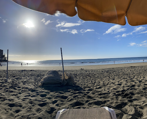 Nice beach in San Agustin right on the promenade. Not many choices for sand beaches on Gran Canaria. Sand is dark with a fine powder that the wind will carry when it gets windy. Parasols and loungers for rent. Rate was 9,50 Euro in February 2025, which is really fair compared to, for example, Mallorca. Attendant will put up sand barrier on windy days to help with blowing sand. Water is clear with sandy bottom. Surf school sometimes here for beginners. Very convenient to the resort we stayed...