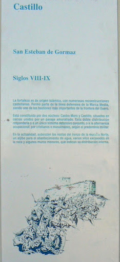 El Castillo de San Esteban en la localidad soriana de San Esteban de Gormaz es una fortaleza de los siglos VIII-IX. Esta situada en un altozano en las afueras de la localidad. De origen islamico, se realizaron posteriormente numerosas reconstrucciones por los castellanos. Formaba parte de la linea defensiva de la Marca Media, y era uno de los bastiones defensivos de la frontera del Duero. Esta constituido por dos nucleos: el Castro Moro y el Castillo unidos por un pasaje amurallado. Esta doble distribucion parece que obedeceria a que fue ocupada alternativamente por musulmanes y cristianos, segun quien dominara la zona militarmente en cada momento. En la actualidad esta semiderruido, y solo se conservan los restos del lienzo de la muralla norte, un aljibe para el abastecimiento de agua, algunos silos excavados en la roca y restos de muros menores que nos indican la distribucion interior. Es una pena el estado de conservacion actual, y España deberia invertir mas en la restauracion de nuestro importante patrimonio historico y cultural, del que esta fortaleza es una pieza fundamental: "Las piedras son historia y forman parte de lo que somos nosotros ahora. Una pena que el mal llamado progreso, este significando el abandono de...