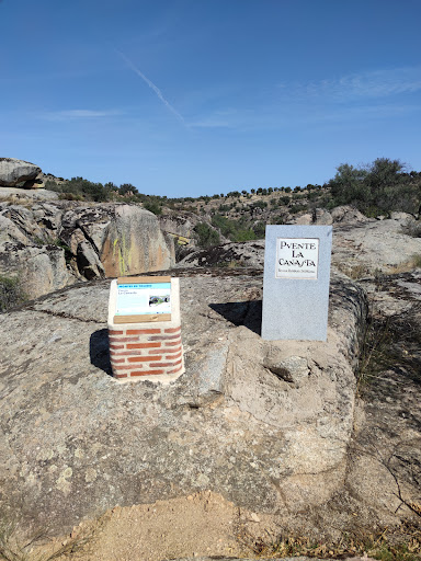 Historia: Conocido popularmente como Puente Romano La Canasta, lo cierto es que fue construido en 1842-1843 sobre la que debió ser una calzada romana secundaria que unía dos de las rutas más utilizadas en aquella época, la de Tarragona-Mérida y Ávila-Córdoba. En el lugar en el que fue construido había, anteriormente, un puente de madera.