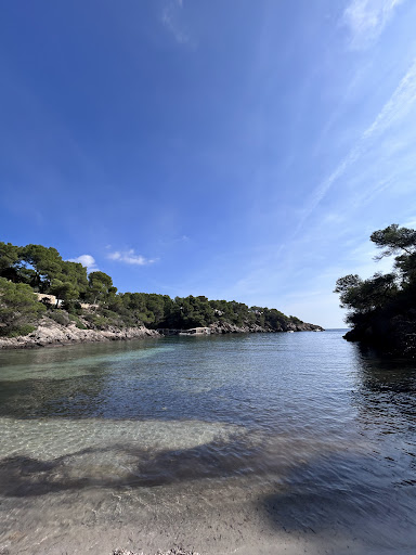 Es una cala estrecha, con arena mezclada con grava y rocas, rodeada de pinos que caen casi hasta el agua. El mar es tranquilo, transparente y con fondos rocosos, lo que la convierte en un lugar ideal para quienes disfrutan del snorkel y de descubrir pequeños rincones bajo el agua.