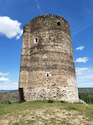 "Estratégica torre cilíndrica de más de 20 metros de altura, carente de almenas, y que, por los mechinales, se adivina que tenía cinco plantas. Posee un bajante común para las letrinas de las plantas primera y cuarta, y chimenea común a todas las plantas.