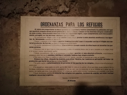 Read moreEn el centro de Santander, cerca de la plaza porticada y al lado del museo arqueológico se encuentra el unico refugio antiareo visitable por el publico en Santander. Con capacidad para unas 82 personas, sentadas unas al lado de otras, podian soportar los bombardeos de los aviones de la legión Condor del bando "nacional" que inflingieron a la ciudad. El refugio es abovedado para dar mayor sustento a la tierra y piedra que lo separaba hasta la cota cero de la plaza que se wncuentra justo encima. Esa distancia de tierra se ha reducido considerablemente en alguna de las remodelaciones de la plaza superior. Dentro proyectan un video con imagenes de película de incendios provocados por las bombas asi como otras fotos de los aviones, etc. Todo ello con sonido de las sirenas q alertaban a los ciudadanos de Santander republicana entonces, a cobijarse ante la aparición de la aviación nacional con aviones nazis alemanes de la Legión Cóndor el 27 de diciembre de 1936 durante la guerra civil que duró desde el 18 julio de 1936 al 1...