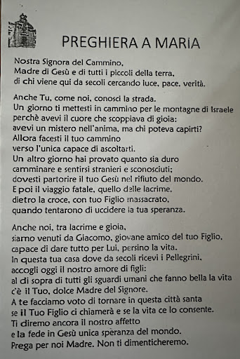 Santa Maria del cammino. Questa chiesa, tra l’altro, era ed è la prima chiesa che un pellegrino incontrava entrando a Santiago prima di visitare la cattedrale, ma forse non tutti sanno che in questa chiesa quanto il pellegrino con fatica e all’estremo delle forze arrivava a Santiago visitava questo culto per recitare una preghiera (antica) con la promessa del ritorno davanti alla Madonna dell’Aurora qualora la buona salute l’avrebbe permesso. Questa antichissima preghiera è stata tradotta verosimilmente dei padri Galliani di cui pubblico il volantino. A nome del gruppo di accoglienza dei pellegrini italiani, vi informiamo che ogni pomeriggio, alle ore 16:30, tutti gli italiani presenti in città si trovano nella chiesa di Santa Maria del cammino a circa 150 m dalla cattedrale: c’è: la Santa messa in lingua italiana, un incontro con padre Fabio sul significato del cammino, e la possibilità della comunione in italiano. Ci farebbe piacere incontrarvi: venite a Santa Maria del cammino ogni pomeriggio alle ore 16:30. Ancora benvenuti e buon pellegrinaggio.