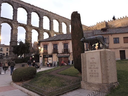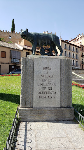 Read moreLa loba capitolina con los genelos Rómulo y Remo. La estatua representa una parte de la leyenda de la fundación de Roma y se convirtió en uno de los símbolos del poder del Senado y el pueblo. La loba (luperca) amamantó a los gemelos cuando fueron abandonados y les ayudo a sobrevivir. Después, los hermanos siguiendo las indicaciones del oráculo, decidieron crear la ciudad de Roma; durante los rituales de fundación, una discursión entre Rómulo y Remo termino con la muerte de Remo; con lo cual Rómulo se convirtió en el el fundador de Roma. La estatua se encuentra al lado del acueducto de Segovia, que sirvió para suministrar agua...