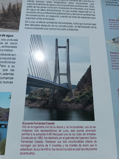 Read moreEs un puente atirantado que se encuentra en la provincia de León y a 12 km del Principado de Asturias y forma parte de la autovía de la ruta de la plata que une el norte de España con el sur, y que fue inagurado en 1983 Tiene 2 torres de 110 metros de altura y 643 metros de longitud y fue diseñada por ingeniero de caminos, Javier Manterola aunque también a l ingeniero, Carlos Fernández Casado, en reconocimiento a la trayectoria y labor en el mundo de los puentes. Como anécdota conviene saber que ha sido un puente atirantado con el vano más" largo del mundo" durante algunos años, el vano de 440 metros y también el récord de longitud de un puente atirantado de hormigón pretensado, todo esto se suma a las grandes vistas de las montañas y los valles que merecen la pena ver algo así en...