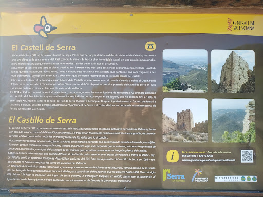 Read moreEl castillo de Serra se construyó entre los siglos VIII y IX y es de origen islámico. Su función era defensiva y de vigilancia por su posición geográfica en la sierra Calderona cercana a Sagunto y al camino norte de Valencia. A finales del siglo XI fue conquistada por el Cid en su camino hacia la ciudad de Balansiya (la actual Valencia). Se puede llegar al castillo a través de una ruta circular de unos 6 kilómetros y medio que parte muy cerca del parking que hay frente al ayuntamiento. Desde aquí son unos 3 kilómetros hasta el castillo (unos 40 minutos), la mayor parte por pista forestal de muy fácil acceso. El camino llega hasta la base del castillo y ahí hay un corto y abrupto sendero que llega directamente al castillo (este último tramo algo más complicado). Desde lo alto del castillo se tienen unas excepcionales vistas del entorno e incluso del mar. Por este mismo camino está muy cerca la font de l'Ombria. La vuelta se hace por una pista forestal de fácil acceso y muy utilizada por ciclistas. Muy recomendable y muy sencilla para...