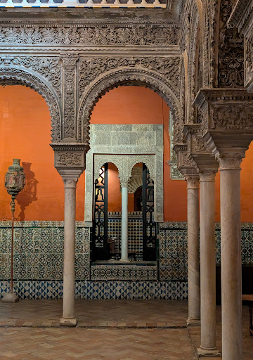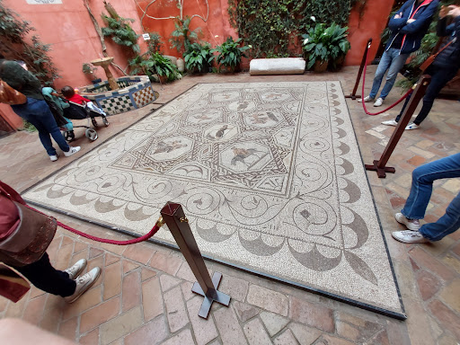 There’s this big courtyard and rooms that look just like they did in the 1500s. The walls are covered with these old-school colored tiles, and there’s this awesome ancient mosaic of Bacchus. Upstairs, there are windows made by Cartuja de Sevilla-Pickman, and the courtyard’s got stairs leading to this dining area that’s cool in summer and...