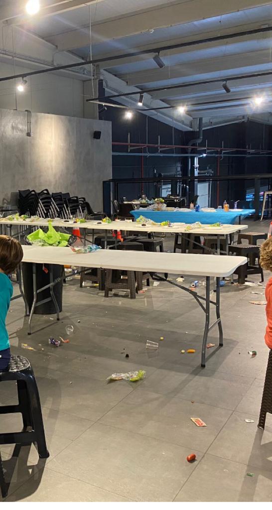 El lugar que se nos adjudicó para la merienda debió está ocupada por un cumpleaños anterior y estaba en unas condiciones de limpieza lamentable. Estaban todos los restos por allí tirados, no habían recogido nada y estaba todo asqueroso. Nos dijeron que es que no habían tenido tiempo de recoger…comida por el suelo, las mesas sucias, papeles por todos lados, cubos de basura a rebosar… Adjunto fotos que tomamos para mostrárselo. Como en las 2 mesas que habían preparado para nuestro cumpleaños no cabían todos los niños, nos cogieron una pequeña que había por allí, sucia y sin poner siquiera un mantel. La persona que nos atendió (1, solo 1 para 34 niños!) estaba desbordada y nos atendió con muy poca amabilidad. El reparto de las piezas de pizza lo hizo ella…con las manos cogiendo una servilleta. Qué falta de higiene. La manipulación de alimento la hacen así normalmente?