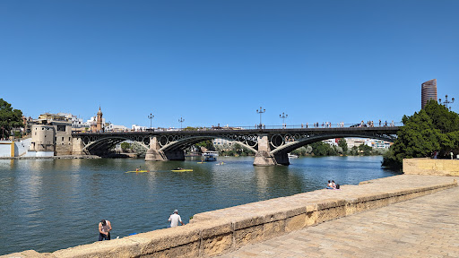 Read moreThe Puente de Isabel II, also known as the Triana Bridge, is a historic bridge that spans the Guadalquivir River in Seville, connecting the city center with the Triana neighborhood. The bridge was built in the mid-19th century and is named after Queen Isabella II of Spain. It features a stunning iron structure and ornate lampposts that light up at night, creating a beautiful and romantic atmosphere. The bridge offers panoramic views of the river and the city, and it's a popular spot for tourists and locals alike to take a stroll and enjoy the scenery. The Triana neighborhood, located on the other side of the bridge, is known for its lively atmosphere, traditional flamenco bars, and colorful ceramics shops, making it a must-visit destination for anyone...
