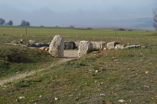 Acceso en coche sin problemas hasta las escalinatas de acceso, luego hay una pista firme hasta que llegas a otra escalera corta (llegas en dos o tres minutos). Según la biblio es de finales del neolítico, unos 6000 años, con posterior reutilización en la Edad del Cobre. Está en una pequeña elevación desde la que se domina todo el valle. En muchos sitios lo definen tipo cromlech, no sé porqué. Es del tipo cámara y corredor y resulta curioso que los ortostatos aparezcan tumbados (sólo se ve una hilada). El leve túmulo debe ser una reconstrucción posterior, el original no se ha conservado, al igual que el corredor. Lo que más me ha llamado la atención es la recreación del monumento que hay en el panel exterior, se muestran un par de hiladas tumbadas, con adobes o barro encima y un techado de madera cubriendolo todo. En fin, no hay mucho que ver pero se ha hecho el esfuerzo de acercarlo al público, enhorabuena. Uno de los paneles no se lee. En el ayuntamiento de Simancas creo que hay un vídeo, una maqueta y réplicas de los materiales que...