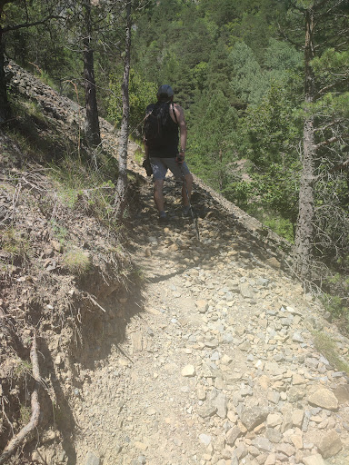 Una ruta sencilla y que se recorre en su mayor parte por una senda cĂłmoda y a la sombra. Ideal en dĂas de ola de calor como hoy. Nosotros no la realizamos entera, ya que el trayecto ida y vuelta son 28 km. Tened en cuenta que ,debido posiblemente a algĂșn desprendimiento que ha afectado al camino original, un pequeño tramo de la senda se convierte en una bajada y una subida por un camino de piedra suelta, que nada tiene que ver con la comodidad de la senda...