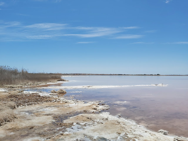 As lovely as ever. All the grapetrees are hacked back to about 20 inches off the floor. They look like small blackened stumps and it amazes me each year when I see them develop into small but grape bearing shrubs weighed down with the grapes. I love this walk which only takes about half an hour. In May you see these blackened stumps have grown leaves, in July you can see the bunches of grapes growing, in Sept. Oct. The grapes are harvested.. Then the shrubs are cut back and tended ready for the next year. Apart from this you have wonderful views of the lake, all the flamingos when they are resident and healthy country air to breath. That is why I walk this way often...