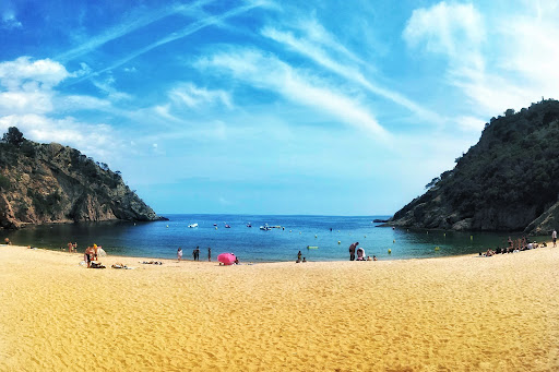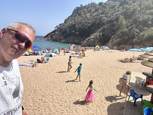 Read moreDe entrada, hay una barrera a unos 150 metros de la playa donde se pagan 12€ por coche o 5€ por moto para acceder. Una vez aparcas ( la moto en nuestro caso ) , llegas a una calita de arena no demasiado fina ( ideal porque no se pega a la piel ) y bastante reducida de dimensiones. Dispone ( literalmente ) de de doce conjuntos de hamacas y sombrillas al precio de 15€, aunque si llegas después de las 11 seguramente no encontraras ninguna libre. También dispone de chiringuito donde comer un bocadillo frio o caliente, degustar una ensalada, tomar un café, una cerveza o un refresco. Después de haberte instalado decides que ya es hora de darte un remojón en sus aguas cristalinas, pero oh !!! cuando llegas a la orilla te das cuenta de que hay un cinturón de cantos rodados que se clavan en la planta de los pies y que no facilitan demasiado la entrada al mar. Pero si vas hasta la punta derecha de la cala, allí no hay apenas piedras y la entrada se realiza sin ninguna clase de trauma, sobretodo para los frioleros. Y cuando el hambre aprieta, te puedes dar una ducha de agua dulce allí mismo y acto seguido subir por unas escaleras al complejo turístico que dispone de terraza con self-service donde almorzar a partir de unos 8,5€ o un comedor aparte donde comer a la carta, mientras una banda de heptagenarios alemanes ( creo ) te amenizan la comida a ritmo de swing. Lugar recomendable para dejarse caer solo de vez en cuando, porque llegar hasta allí y pagar 20€ por entrar con moto + tumbona + hamacas ( y sin contar con el gasto en comida ) queda fuera del alcance de los humildes...