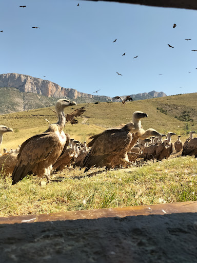 Una vez a la semana llevan los restos de las carnicerias de Tremp a este lugar, donde tradicionalmente los pastores dejaban el ganado muerto, para que buitres leonados, buitres negros, rompehuesos y otros carroñeros tengan un pequeño complemento a su dieta habitual. Des la llegada a la oficina del pueblo puedes verlos sobrevolar el coche amarillo de la comida, y, en la lejania del mirador podras ver unos 150 metros como se alimentan. Algunas fotos que salen aqui es de una excursión privada que te deja justo donde comen pero vale 70 euros (no es esta). Esta actividad es gratuita y con reserva previa La guia y la información de la oficina es completisima y los buitres vuelan bastante cerca. Impresiona y vale...