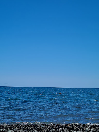 It's a stony, black sand, beach. There's not much there but there does seem to be a popular cafe but, from the smell of it, it's mainly a fish place... a smell that is pretty strong.
