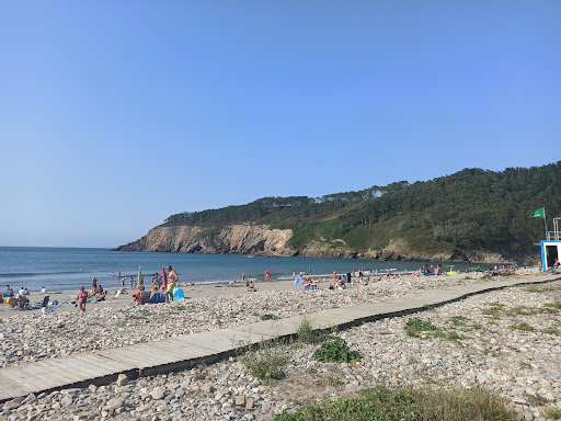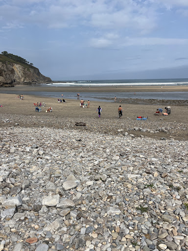 En la parte derecha de la playa mirando al mar, llega la desembocadura del río Esva, que es muy caudaloso, y ello forma un paraje muy bello y la posibilidad de bañarte tanto en el mar...
