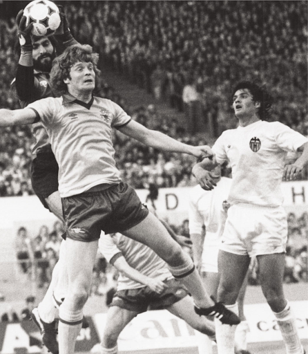 Valencia’s team goalkeeper Pereira claims the ball in the 1980 European Cup Winners’ Cup. His side, with their iconic bat motif, overcame Arsenal 5-4...