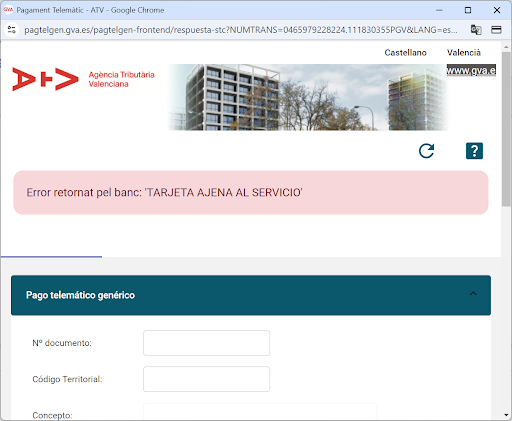 Efectivamente, la única respuesta que siempre he recibido era una mezcla entre "no son nosotros que nos ocupemos de las certificaciones" (de sus propios estudiantes? Incredible no?), "tienes que contactar a la Agencia Tributaria Valenciana" (pero sin darme ningun contacto) y " lo único que tienes que hacer es rellenar y mandar un MODELO 046 CPR: 9056436" lo que he hecho regularmente durante los últimos meses, con tarjetas bancarias diferentes, con las cuales confirmamos el pago, pero siempre acaba por el mismo mensaje de error (adjunto a continuación).