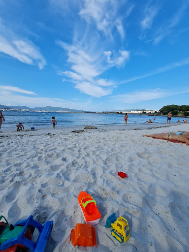 Es una arenal de tamaño pequeño pero está genial para venir con niños y perros se les puede tener controlados hay una buena de barrera natural a los lados donde no se pueden escapar y sombra y papelera el agua esta muy limpia no hay tanta gente como en la playa de Samil mucho más fácil de aparcar y estacionar en general cómo punto negativo diría que no hay ningún servicio por aquí dónde comprar algo de...