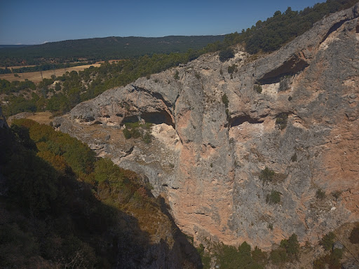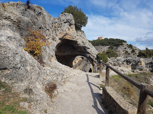 Este doble balcón natural, creado por la erosión de la zona esta tan solo a 11 km de la Ciudad Encantada. Hay indicaciones y un parking gratuito de tierra, bastante amplio. ¿Qué es?, pues un doble ventanal natural creado por la erosión de miles de años de la zona del paisaje karstico de cuenca. Hay algún añadido hecho por el hombre, suelo arreglado y barandillas. ¿ Qué se ve? Pues se puede apreciar las hoces del Río Jucar, desde una visión panorámica, un lugar perfecto para observar y hacerse fotos. Además de ver la erosión que han originado el agua y el viento, y el Río Jucar, es un lugar de asentamiento de buitres Leonados que podrás ver sobrevolando la zona, incluso algún nido donde se posaran. A tener en cuenta: El acceso es gratuito, pero depende de la época puedes encontrarlo lleno y se hace más difícil disfrutarlo y hacerse fotos. El recorrido del parking hasta el ventano es de dos minutos, así que no perderás mucho tiempo ni en llegar, ni en verlo (lo que tu quieras). Hay escalones (unos 10, lo que dificulta la entrada a sillas de ruedas, a no ser que vaya acompañado de un par de personas que puedan levantarla/o y bajar esos escalones). Los carritos de bebe, pues lo mismo que lo anterior, sólo que con mucho menos peso, más fácil. Recomiendo llevar prismáticos para ver la cantidad de buitres Leonados que hay (además del paisaje), si te fijas y llevas buenos prismáticos, podrás ver nidos, con las crías. Una última cosa, si vienes desde la Ciudad Encantada, unos 3 minutos antes de llegar al Ventano del Diablo, se ve en el paisaje un puente (no puedo decir la época, ni que es (un acueducto, un puente...), hay un pequeño sitio donde dejar el coche fuera de la carretera y podrás verlo mejor. Son la últimas...